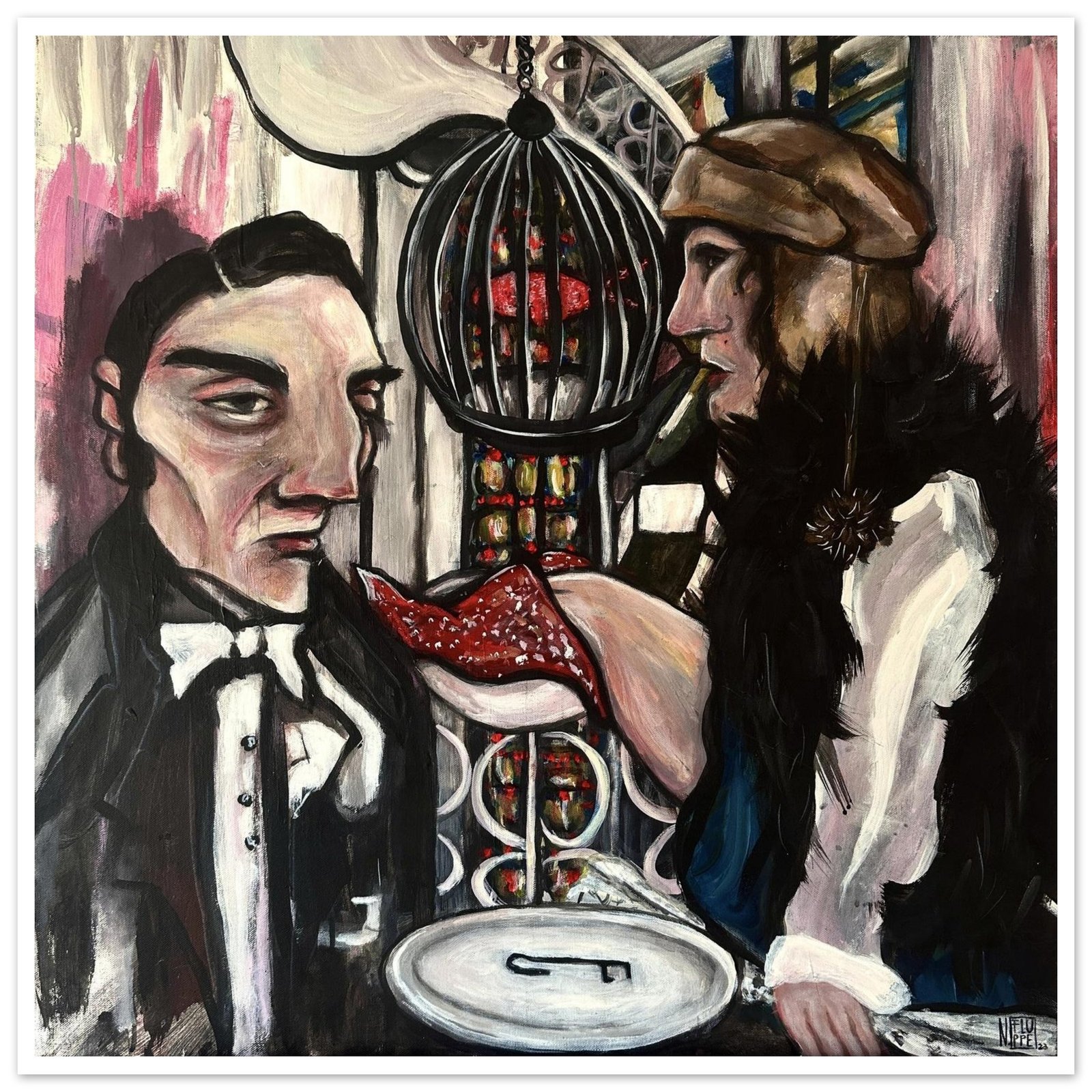 Print of painting “Fish in a Cage”, created with mixed media on canvas.